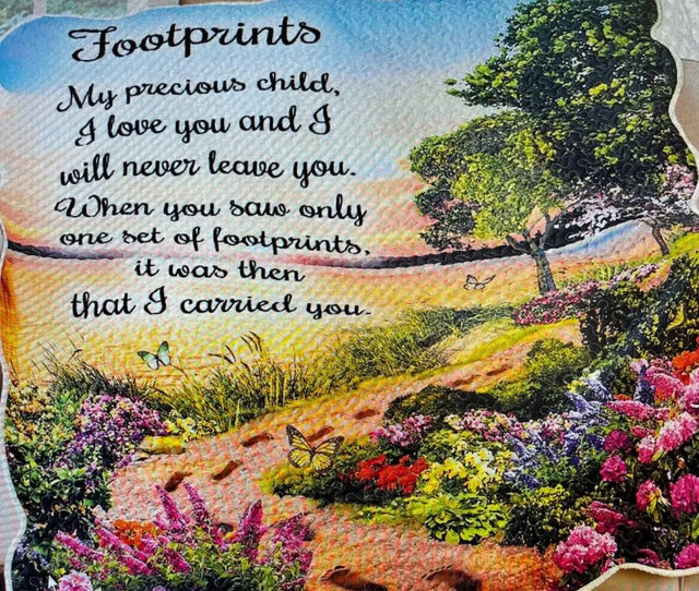 The Footprints Sunset Quilted Throw is a stunning addition to any home. Its beautiful design and rich colors enhance the printed lakeside scene and flower-edged path, while the verse of footprints in the sand adds a touch of inspiration. The white scalloped edge and quilted texture complete the look of this machine-washable throw. Made with high-quality polyester, it's both stylish and durable.